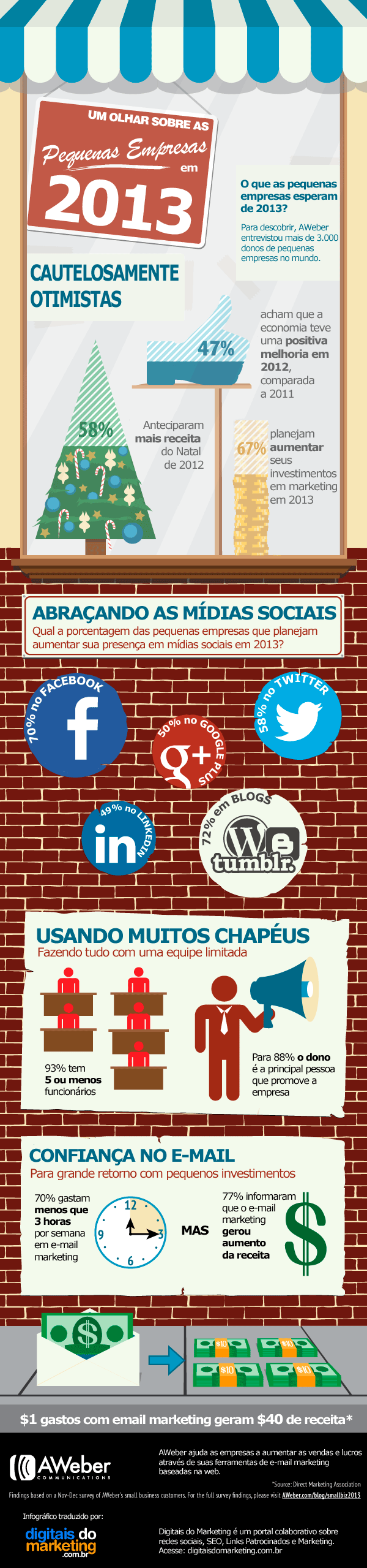 A AWeber entrevistou mais de 3.000 empreendedores de como sentiram os efeitos da economia em 2012 e como pretendiam aumentar seus investimentos. Com estas informações em mãos criou o infográfico: Um olhar sobre as Pequenas Empresas em 2013.